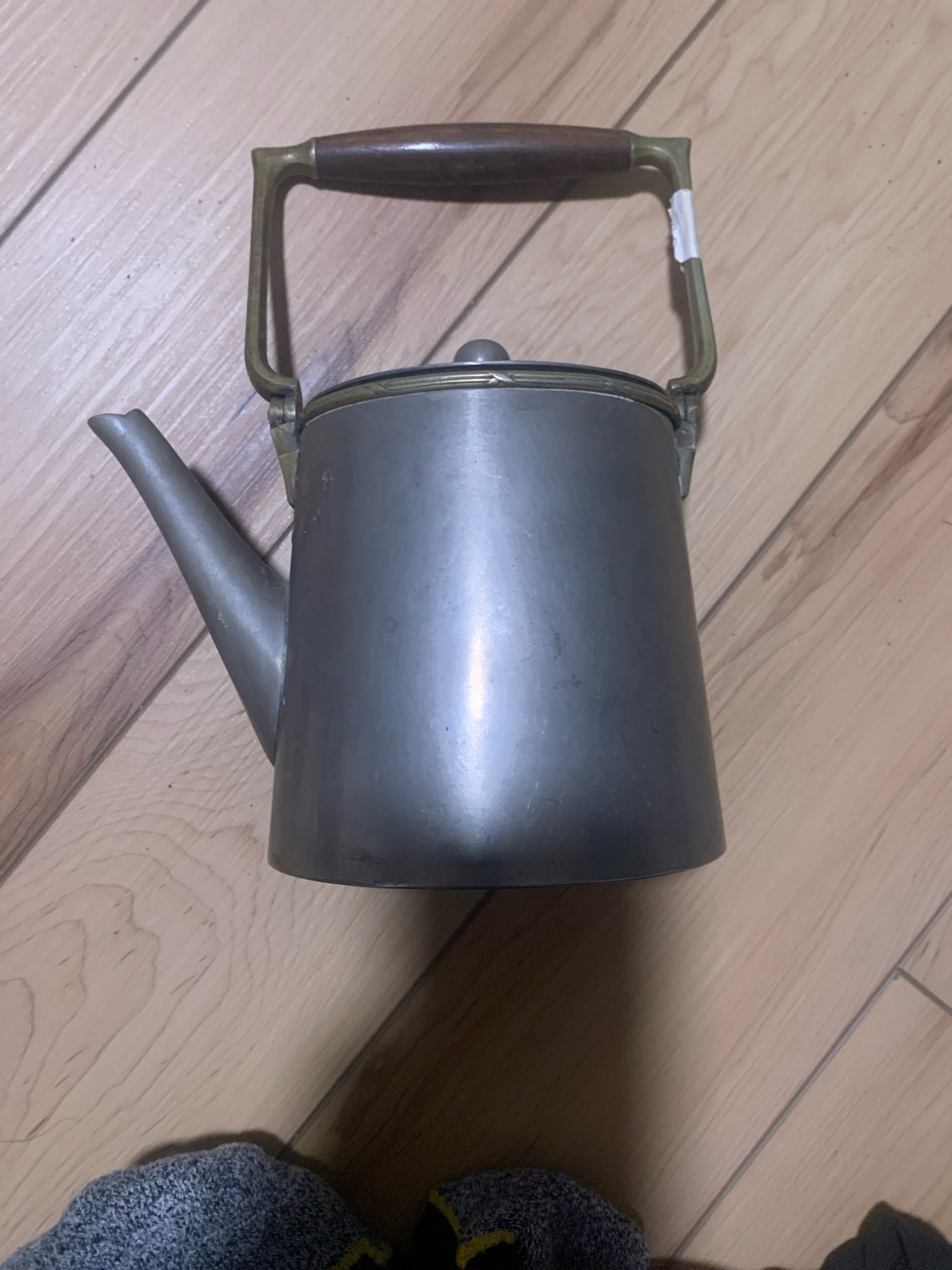 This is a vintage tea kettle featuring a tapered, cylindrical body likely constructed from a heavy-gauge pewter or lead-free alloy with a matte grey finish. The construction demonstrates a clear utilitarian but elegant aesthetic, often associated with Mid-Century Modern or Scandinavian design movements (circa 1950s-1970s). The kettle is fitted with a fixed, decorative brass rim along the top edge and a tall, brass swing handle featuring a central, ergonomically turned wooden grip, possibly teak or walnut. The wooden handle shows a rich, dark patina and remains intact without visible cracks. The spout is a simple, gooseneck-style curve integrated into the side of the body. Surface condition shows moderate signs of age and use, including scattered scuffs, superficial scratches, and minor dark oxidation spotting typical of pewter alloys. There is a small piece of white adhesive or tape on the right side of the brass handle bracket. The brass elements exhibit a natural aged patina with slight tarnishing, particularly near the hinge points. No significant dents or structural deformations are visible in this view, suggesting high-quality manufacture. While a specific maker's mark is not visible from this angle, the style is reminiscent of pieces by designers like Georg Jensen or various high-end American pewter smiths of the mid-20th century.