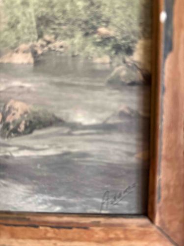 This item is a vintage representational landscape print, likely a lithograph or photogravure with hand-colored elements, set within a rustic wooden frame. The artwork depicts a serene river scene with flowing water over rocks and lush green foliage in the background. The color palette is composed of muted greens, soft blues, and earthy browns, which is characteristic of early 20th-century colorization techniques. In the lower right corner, there is a visible cursive signature that appears to read 'Adams,' possibly referring to a commercial artist or studio from the early 1900s. The frame is constructed from a medium-toned wood, showing a rectangular profile with natural grain patterns visible. Regarding condition, the frame exhibits significant wear including scratches, abrasions, and areas of finish loss, particularly along the right inner edge and bottom rail. The artwork itself shows some softening of detail and possible slight fading from UV exposure over time. This piece appears to be a mass-produced decorative interior item from the 1920s to 1940s, popular in American middle-class homes as accessible landscape art.