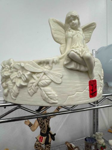 This is a decorative ceramic or resin figurine base featuring a whimsical garden fairy motif. The item is monochromatic with an off-white or cream matte finish, typical of unglazed porcelain (bisque) or molded cold-cast resin. The central figure is a young fairy with butterfly-like wings, seated on the edge of a cylindrical base. Her features are delicate, and she is depicted wearing a simple dress. The base itself is heavily ornamented with high-relief carvings of nature scenes, including a prominent dragonfly on the front-left and various flowers and textured leaf patterns. The texture of the base mimics raw stone or bark. The craftsmanship shows moderate detail in the wing patterns and leaf veins, suggesting it was likely mass-produced in the late 20th century, possibly the 1990s. Regarding condition, it appears dusty with some surface grime and a noticeable red price sticker on the lower right flank. There are no major visible cracks or chips from this angle, though the matte surface is prone to scuffing and discoloration. It is a functional piece that likely served as a small planter or a base for a glass bowl.