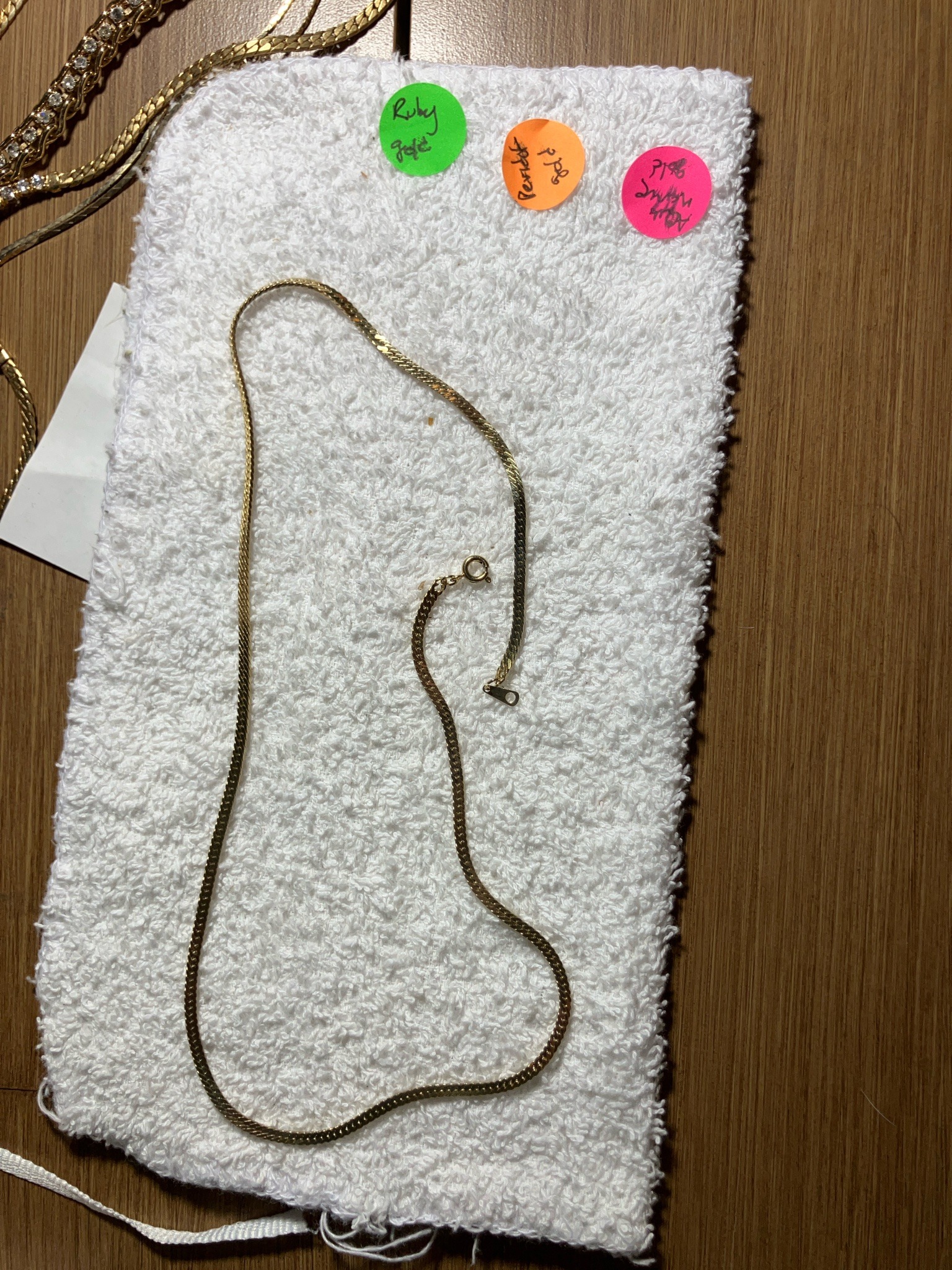 This item is a classic herringbone style chain necklace, likely crafted from 10k or 14k yellow gold based on common manufacturing standards for this design. The necklace features a flat, liquid-like construction composed of slanted, parallel links that interlock to create a smooth, mirrored surface reflective of late 20th-century jewelry trends (circa 1970s-1990s). The chain appears to be approximately 16 to 18 inches in length with a slim width of roughly 2-3mm. It is secured by a traditional spring-ring clasp attached to a stamped end cap. Upon close inspection, the chain exhibits minor surface scratches and slight kinks characteristic of the herringbone weave, which is notoriously delicate and prone to permanent creasing if bent beyond its natural curvature. No major breakages or solder repairs are visible in the current view. The gold hue is consistent throughout, suggesting a high-quality polish and solid gold content rather than plated base metal. The end tab near the clasp likely contains a fineness hallmark (such as '14K') and a maker's mark, though these details are too small for definitive identification from the image. Its fluid drape and high-shine finish indicate superior craftsmanship typical of Italian-made gold exports of the period.