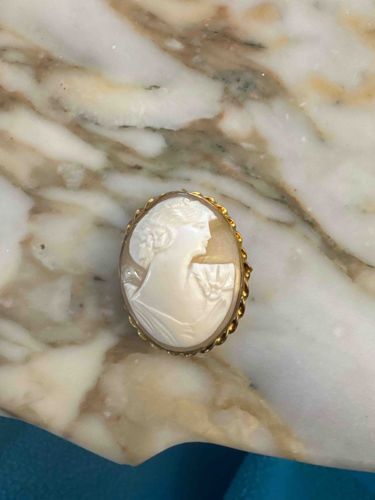 This item is a classic oval cameo, likely hand-carved from a helmet shell (Cassis madagascariensis) or more likely a carnelian shell, evidenced by the creamy white foreground figure against a translucent peachy-tan background. The carving depicts a right-facing profile of a Neo-Classical woman, frequently identified as a 'Lady' or 'Bacchante,' featuring finely detailed wavy hair secured with a floral headband and wearing a draped garment with a flower pinned at the shoulder. The piece is set within a simple but elegant gold-tone metal frame characterized by a decorative twisted-wire or 'rope' border. Based on the carving style and hairstyle, the piece likely dates to the mid-20th century (circa 1940s-1970s). The carving is of good quality, showing depth and dimensionality beyond basic mass-produced plastic variants. There are no visible cracks or 'hairlines' in the shell, though subtle natural striations are present. The metal frame shows minor age-appropriate patina and slight tarnishing, but retains its structural integrity. No signatures or hallmarks are visible on the front; further inspection of the reverse would be required for maker's marks or metal purity stamps. The overall condition appears excellent for its age, with no significant chips or wear to the delicate facial features of the carved figure.