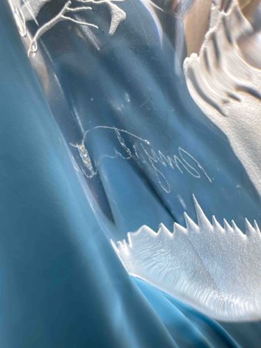 This item is a high-quality lead crystal art piece, notable for its intricate intaglio and deep-etched figurative designs. The image reveals a clear, heavy-gauge crystal body that exhibits excellent light refraction and clarity, characteristic of Tiffany & Co. craftsmanship. The design features a frost-etched motif that appears to depict natural elements, possibly wings or floral structures, characterized by sharp, serrated edges and delicate linework that provides a three-dimensional depth within the glass. A crucial identifying feature is the hand-etched 'Tiffany & Co.' signature in cursive script, visible on the surface of the crystal. This script is indicative of post-mid-20th-century production, likely dating from the 1980s to the early 2000s. The material is colorless, though it reflects a blue hue from its surroundings. Condition-wise, the piece appears to be in excellent vintage condition with no visible cracks or deep chips in the provided view, though fine surface scratches consistent with careful handling may be present upon microscopic inspection. The high-relief etching demonstrates superior technical skill, showcasing the contrast between the polished transparent glass and the matte textured frosted areas. This type of decorative glassware served as prestigious giftware or desk accessories during the late 20th century.