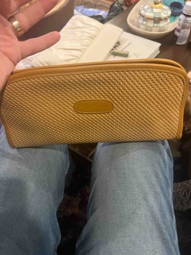 This item is a rectangular clutch handbag featuring an overall mustard yellow or ochre color palette. The body of the bag is constructed with a distinctive textured surface that mimics a basketweave or braided pattern, likely rendered in a coated canvas, vinyl, or embossed leather. It is framed by a smooth, solid-colored piping or trim that runs along the outer perimeter, providing structural reinforcement. A central characteristic is the oval-shaped leather patch on the front face, intended for a monogram or brand logo, though it appears blank in the image. In terms of dimensions, it is an elongated handheld accessory designed for evening or causal use. The construction suggests a mid-to-late 20th-century aesthetic, possibly 1970s or 1980s, common in preppy or equestrian-inspired accessory lines. The condition appears to be well-maintained with no immediate signs of fraying at the edges or heavy staining to the woven-style material. The craftsmanship is evidenced by the consistent stitching along the trim and the symmetrical placement of the central patch. There are no visible maker's marks or signatures on the exterior, suggesting branding may be located on an interior tag or the hardware of the closure mechanism, which is not visible here.