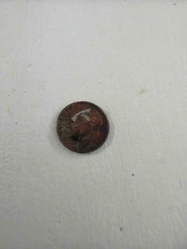 This item is a United States one-cent coin, commonly known as a Lincoln Cent. The obverse side is visible, featuring the profile of Abraham Lincoln facing right, accompanied by the word 'LIBERTY' on the left edge. The coin displays a significant amount of dark, uneven patina and oxidation, typically seen on copper-alloy or copper-plated zinc coins that have been exposed to moisture or harsh environments. A notable white residue or marking resembles a capital 'T' or a chevron symbol, which appears to be applied to the surface rather than struck into the metal. The edges show considerable wear and rounding, indicating extensive circulation. The overall condition is poor, with obscured details such as the date and mint mark due to heavy surface corrosion and environmental damage. The coin measures approximately 19.05 mm in diameter, which is the standard size for this denomination. Based on the visible profile, it belongs to the series initiated in 1909 and still in production today, though its specific production year cannot be identified due to the surface degradation. The quality of the strike is standard for mass-produced currency, but its current state is severely compromised by post-mint damage.