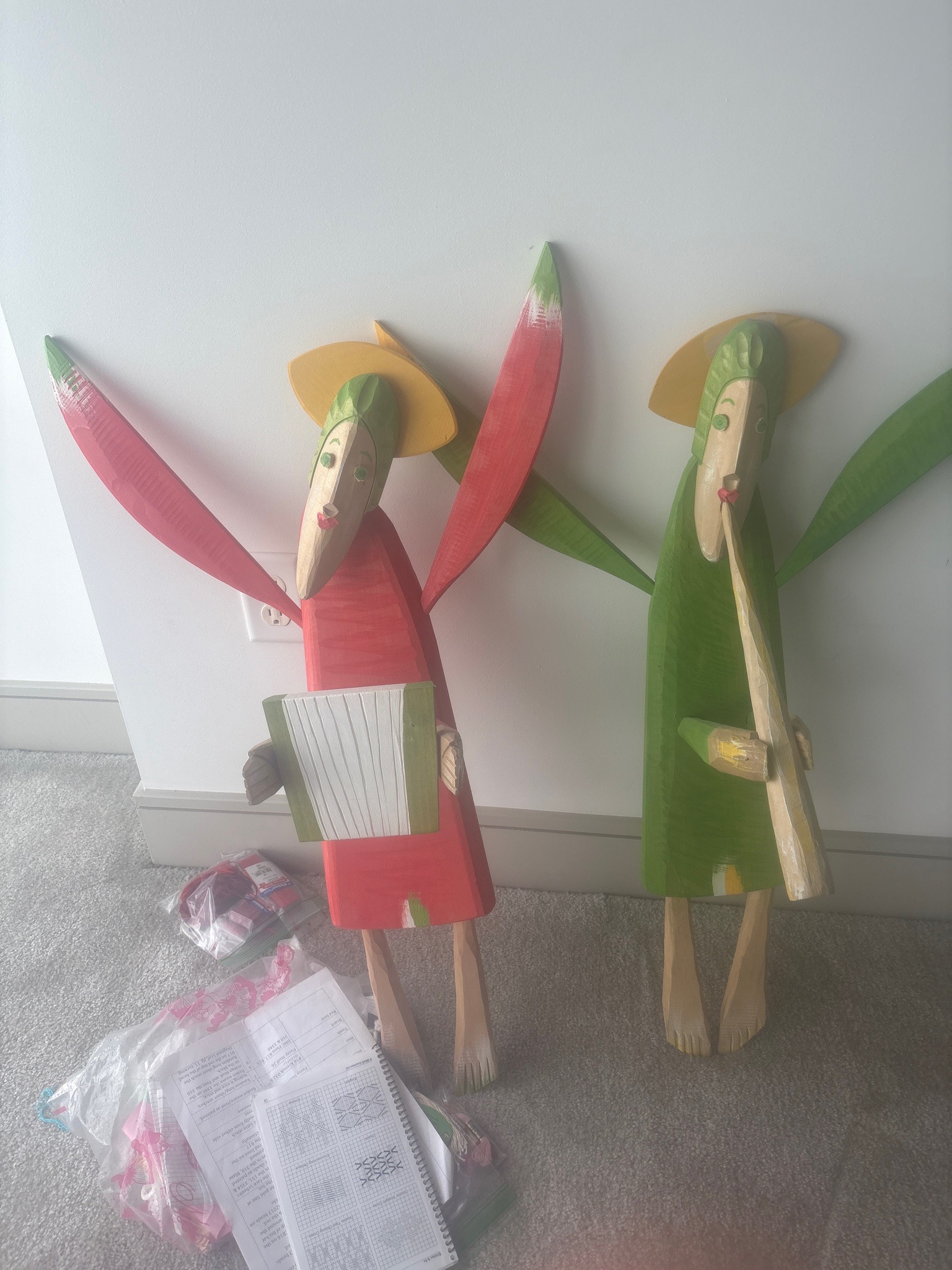 A pair of large-scale, whimsical folk art sculptures depicting winged angels playing musical instruments. One figure is dressed in a vibrant red tunic holding a book (representing a hymnal or accordion), while the other is dressed in green and plays a long wind instrument resembling a flute or horn. The figures exhibit elongated, stylized proportions with tapered faces, thin limbs, and large, pointed wings. They are constructed from solid wood, featuring visible chisel marks and a rough-hewn texture that signals hand-crafted quality. Each angel wears a yellow halo and a green cap. The paint application is vibrant but shows intentional distressing and visible brushstrokes, consistent with folk art traditions. Notable features include small, green-painted eyes and pursed red lips. In terms of condition, there is prominent paint wear and scuffing, particularly on the red angel's book and the edges of the wings, as well as some light chipping at the base of the feet. This suggests they may be late 20th-century creations, possibly inspired by Latin American or American vernacular folk styles. The craftsmanship is characterized by bold, geometric forms and expressive simplicity rather than fine detail.