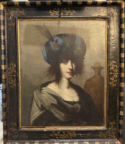 An oil painting on canvas or panel depicting a young woman in an idealized, possibly orientalist costume. The subject wears a voluminous blue and brown turban adorned with an aigrette of fine feathers and a jeweled brooch. She is draped in a dark cloak over a grey-green shawl, accented by a single-strand pearl necklace. In the background, a classical vase rests on a ledge. The style is reminiscent of late Baroque or Neoclassical periods, suggesting a work from circa 1780-1840. The piece is housed in a distinctive, possibly later, black and gold striped frame featuring scrolling foliate gilt motifs. Regarding condition, the canvas appears slightly loose in the frame, particularly at the lower edge. There is visible surface craquelure throughout the paint film, consistent with age. The dark pigments in the background and clothing show signs of minor thinning or possible old overpainting. The frame shows significant wear, including minor losses to the gilded ornamentation and abrasions on the outer edges. No maker's mark or signature is immediately visible on the front surface, which is typical for portraits of this school. The brushwork in the skin tones is soft and blended, while the metallic and fabric textures are handled with more impasto, indicating a practiced hand of the era.