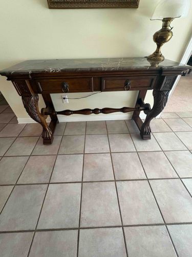 This is a substantial Neoclassical style console table, likely a late 20th-century high-quality reproduction inspired by Empire or Regency furniture. The piece features a rectangular dark variegated marble top with prominent white veining and a bullnose edge. The wooden frame is constructed from a dark-stained hardwood, possibly mahogany or walnut, showcasing a rich, warm patina. The apron contains two flush-mounted drawers, each adorned with ornate cast metal ring pulls featuring lion head bosses. The corners of the apron are punctuated with carved square blocks displaying stylized floral or sunburst motifs. A defining characteristic is the pair of grand cabriole-style front legs, which are intricately carved with acanthus leaf details and terminate in heavy, realistically rendered carved lion's paw feet resting on stepped plinth bases. A turned horizontal stretcher with a central bulbous finial connects the two leg assemblies, adding structural stability and aesthetic balance. The overall craftsmanship suggests a mass-produced but high-end designer furniture line. Condition appears excellent with minimal visible wear; the wood retains a healthy luster, the marble shows no obvious cracks or chips, and the hardware remains intact. The scale and ornate carving make it a statement piece suitable for a grand entryway or hallway.