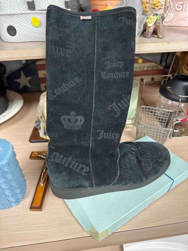 This is a single tall, pull-on style boot from the fashion brand Juicy Couture. The boot is constructed from black suede or a suede-like synthetic material. It features an all-over tonal monogram print consisting of the 'Juicy Couture' logo in a stylized gothic font alongside crown icons, which are hallmark motifs of the brand. The boot has a rounded toe and a flat, textured rubber or EVA composite sole typical of casual winter footwear. A small pink rectangular brand tag is visible at the top back collar of the shaft. Physically, the boot exhibits a tall shaft reaching approximately mid-calf. The condition shows moderate signs of wear including some fading of the black pigment, minor surface scuffing particularly around the toe box, and some accumulated dust or lint on the nap of the material. There are no obvious structural repairs or heavy sole erosion visible. This style is characteristic of the late 2000s or early 2010s mainstream fashion aesthetic, often referred to as Y2K or McBling revival fashion today. The craftsmanship utilizes machine stitching with a visible vertical seam running down the front of the shaft, which is a common construction method for this mass-market luxury leisurewear brand.