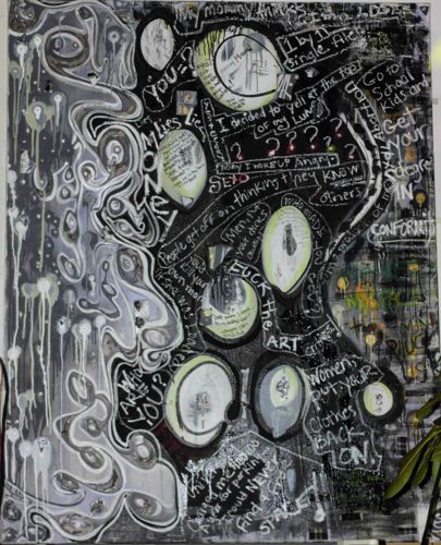 This is a large-scale, vertically oriented mixed-media painting categorized by a raw, Neo-Expressionist style reminiscent of street art and the works of Jean-Michel Basquiat. The composition is divided into two primary zones: the left side feature abstract, flowing grey and white dripped patterns that create a fluid, organic texture, while the right side is dominated by a dark, charcoal-black background heavily overlaid with handwritten text, scrawled phrases, and crude symbols. The palette is strictly monochromatic, utilizing shades of black, white, and various grays. Within the dark field, there are several light-colored, ovoid shapes containing additional text and scribbled images, functioning like thought bubbles or portals. The text includes highly provocative and nihilistic phrases such as 'MY MOMMY THINKS I’M A LOSER,' 'LIES LIES LIES,' and 'FUCK THE ART.' The construction appears to be acrylic or spray paint on canvas, with visible layering, heavy impasto in areas, and intentional drip marks. The condition shows a deliberate 'distressed' appearance consistent with the urban art style, though no unintentional damage is immediately apparent. The craftsmanship is characterized by high energy and spontaneous mark-making, likely dating from the late 20th to early 21st century. No signature is visible in this view, suggesting the artist's identity may be on the reverse or integrated into the chaotic script.