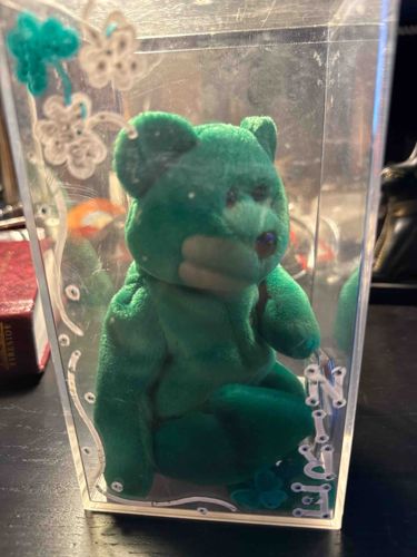 This item is a Ty Erin the Bear Beanie Baby, a classic collectible plush from the late 1990s. The bear is approximately 8 to 9 inches tall and features a vibrant emerald green polyester fiber and P.E. pellet construction. It is designed in a seated position with a soft, plush textured body. A notable feature is the embroidered white three-leaf shamrock on the left breast, symbolizing its Irish theme associated with St. Patrick's Day. The piece is housed inside a custom clear acrylic display case adorned with white and green floral/vine decals and the name 'ERIN' printed vertically on the front. The bear appears to be in excellent condition, with pristine fabric and no visible signs of fading or sun damage, although the heart-shaped 'hang tag' and fabric 'tush tag' are obscured by the case's positioning. The case itself shows some surface scuffs and dust, but serves to preserve the internal item. These bears were mass-produced starting in 1997, and were part of the Beanie Baby frenzy, making them iconic cultural artifacts of that era. The craftsmanship is typical of high-volume plush toys from the period, featuring secure plastic 'bead' eyes and a matching plastic nose.