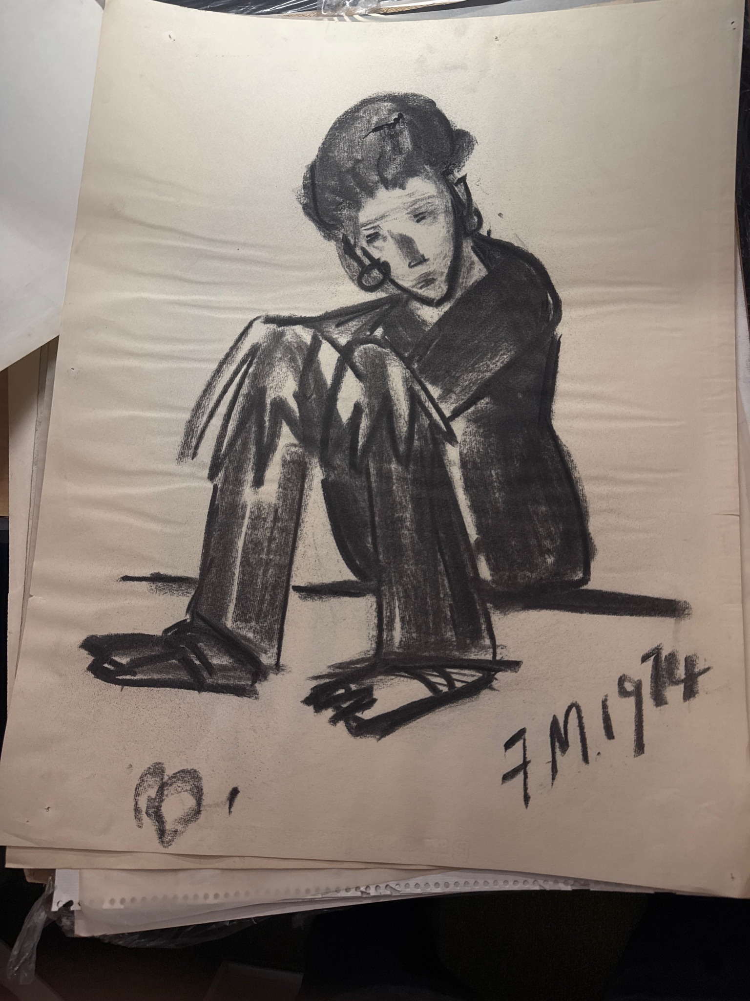 This is an original charcoal or soft graphite drawing on paper, depicting a melancholic seated figure. The piece exhibits an expressionist style characterized by bold, gestural strokes and high-contrast tonal values. The subject is shown sitting with knees pulled toward the chest, wearing what appear to be sandals and a dark garment. Physically, the artwork is rendered on a light-cream or off-white paper stock with a noticeable horizontal undulating texture, likely due to past moisture exposure or improper storage, resulting in cockling across the surface. Notable markings include the inscription '7 M 1974' in the lower-right corner, suggesting an execution date of 1974. There is an additional abstract mark or monogram in the lower-left. The paper shows signs of aging, including minor edge wear, several visible pinholes in the upper corners consistent with studio display, and light creasing along the margins. The craftsmanship reflects a confident, rapid execution with significant pressure applied to the drawing medium, creating deep blacks against the paper's natural tooth. The aesthetic leans toward mid-to-late 20th-century modernism, focusing on emotional resonance over anatomical precision.