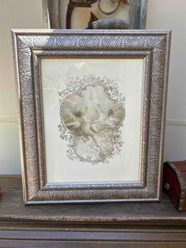 This item is a decorative wall artwork featuring a monochromatic etching of two playful cherubs or putti. The central image is rendered in a soft sepia or grey tone, enclosed within an intricate cartouche of floral swags and scrollwork, characteristic of the Rococo Revival style. The central figures are depicted in a dynamic, celestial scene, reaching upward toward a source of light. The art is centered on a cream-colored paper ground and is protected by glass within a wide, highly ornate metallic-finish frame. The frame features two distinct tiers of embossed acanthus leaf or shell-like patterns, finished in an antique silver or pewter tone with a dark patina in the recessed areas to accentuate the sculptural detail. The construction of the frame appears modern, possibly resin or molded composite finished to mimic aged metal. The over-all condition appears good with no visible chips to the frame or foxing on the print, though sunlight reflections on the glass obscure some fine details. This piece likely dates from the late 20th century, designed to emulate 18th-century European classical aesthetics. The craftsmanship of the embossed frame suggests a high-quality decorative reproduction rather than a period antique.