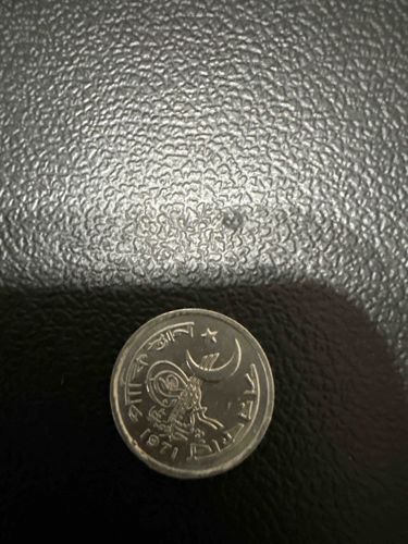This is a 1971 Pakistani 1 Paisa coin, a small denomination of currency issued during a pivotal year in the country’s history. The coin is struck in aluminum, giving it its characteristic lightweight feel and bright, silvery-grey metallic color. The obverse side shown features the crescent moon and five-pointed star, traditional symbols of Pakistan, surrounded by an intricate wreath and the denomination. The date '1971' is clearly visible at the bottom of the design, alongside text in both Urdu and Bengali, signifying the bilingual nature of the state prior to the independence of Bangladesh later that year. Physically, the coin is approximately 17mm in diameter with a round, plain edge. Its condition appears to be 'Fine' to 'Very Fine' based on visible details; there is a moderate amount of surface wear, particularly on the higher points of the crescent and star, and several small scratches consistent with circulation. The strike remains relatively sharp, and the metal has avoided significant oxidation or 'zinc rot' often seen in lighter alloy coins of this era. This specific mintage is historically significant as 1971 marked the end of the united East and West Pakistan, making the bilingual inscriptions a unique historical marker of that era's political climate.
