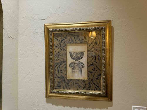 This is a framed decorative art piece featuring a neoclassical motif. The central imagery consists of a black-and-white sketch or print depicting an ornate classical urn resting atop an Ionic column capital. This central figure is set against a rectangular off-white/beige background, which is then matted by a much larger, darker decorative border. The secondary border features a dense, repeating leaf or foliage pattern in muted tones of blue, grey, and gold, providing a sophisticated texture that complements the architectural theme. The entire composition is housed within a broad, ornate wooden frame finished in a classic gold leaf or metallic gilt. The frame construction includes a convex outer edge and a decorative inner border with a repeating 'egg and dart' or beaded relief pattern. The visible condition appears to be excellent, with the gold finish showing a slight aged patina but no significant chips or cracks. The art is protected behind a sheet of clear glass, which shows a reflection of a nearby lamp, indicating a glossy surface. This style of home decor is characteristic of late 20th-century traditional interior design, aiming to evoke a sense of Mediterranean or European antiquity through mass-produced yet high-quality decorative prints.