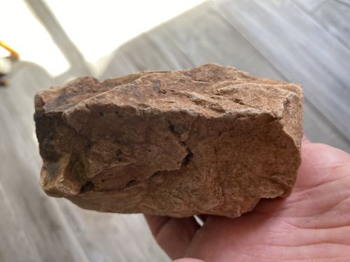 This specimen is a lithic artifact measuring approximately 5 inches in length and 2.25 inches in width, identified as a biface hand axe or scraper tool. It is crafted from a non-homogeneous chert common to the Oklahoma region (Guthrie area). The tool exhibits a distinct reddish-brown to tan coloration, likely resulting from mineral staining and long-term environmental exposure. The physical construction shows evidence of intentional percussion flaking on both sides (bifacial), creating a tapered, wedge-like geometry intended for heavy-duty cutting, chopping, or scraping tasks. The texture is gritty and matte, characteristic of weathered cryptocrystalline silicates. Notable features include multiple flake scars and a prominent ridge along the length, suggesting a utilitarian design for grip and leverage. The condition reflects its age, showing significant smoothing of the edges via natural chemical and physical weathering (patination), and there are visible micro-fractures and surface pitting consistent with geological deposition. While it lacks maker's marks, the technology points to a Lower Paleolithic tradition, though contextual verification of North American Lower Paleolithic sites is rare, making the specific age and cultural affiliation significant points for further study. The craftsmanship is rudimentary but functional, illustrating the early technological adaptation of available stone resources into versatile survival implements.