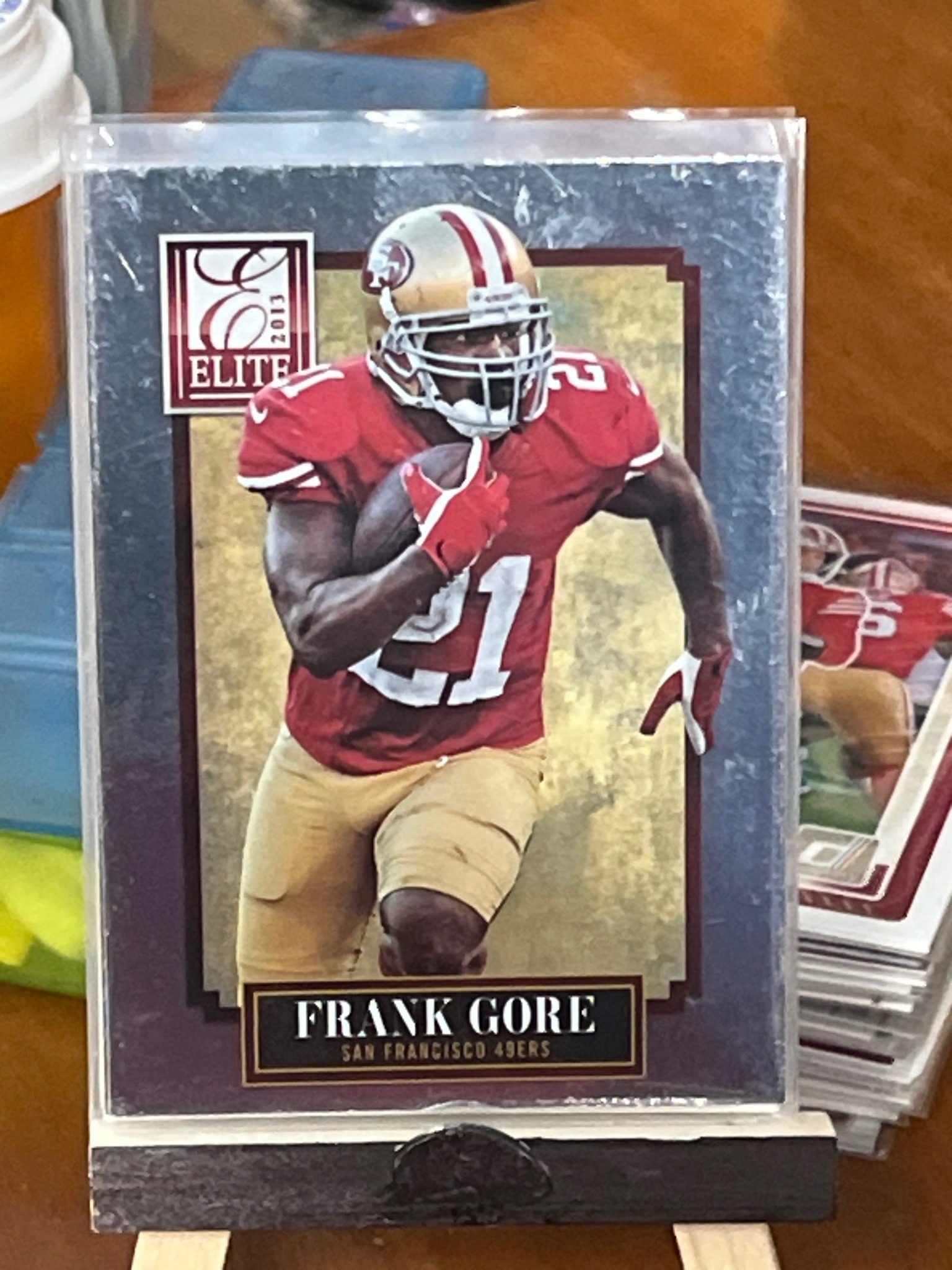 This is a standard-sized 2.5" x 3.5" modern sports trading card featuring Frank Gore of the San Francisco 49ers. The card is part of the 2013 'Elite' series by Panini. The design features a high-action color photograph of the player in his red home jersey and gold pants, centered against a textured gold background. The layout is bordered by a navy blue and deep burgundy frame with a distinctive metallic flake or 'etched' finish on the outer borders. The 'Elite 2013' logo is prominently placed in the upper left corner, while the player's name and team are displayed in an elegant gold-bordered black box at the bottom. The card is currently housed in a clear protective sleeve and resting on a small wooden display stand. Regarding condition, there is visible surface wear and scuffing on the outer plastic sleeve. The card itself shows sharp corners through the plastic, though the top edge shows some minor roughness typical of this specific die-cutting style. The centering appears slightly weighted toward the left. The high-gloss finish and metallic elements are hallmark indicators of Panini’s premium mid-tier production quality from this era.