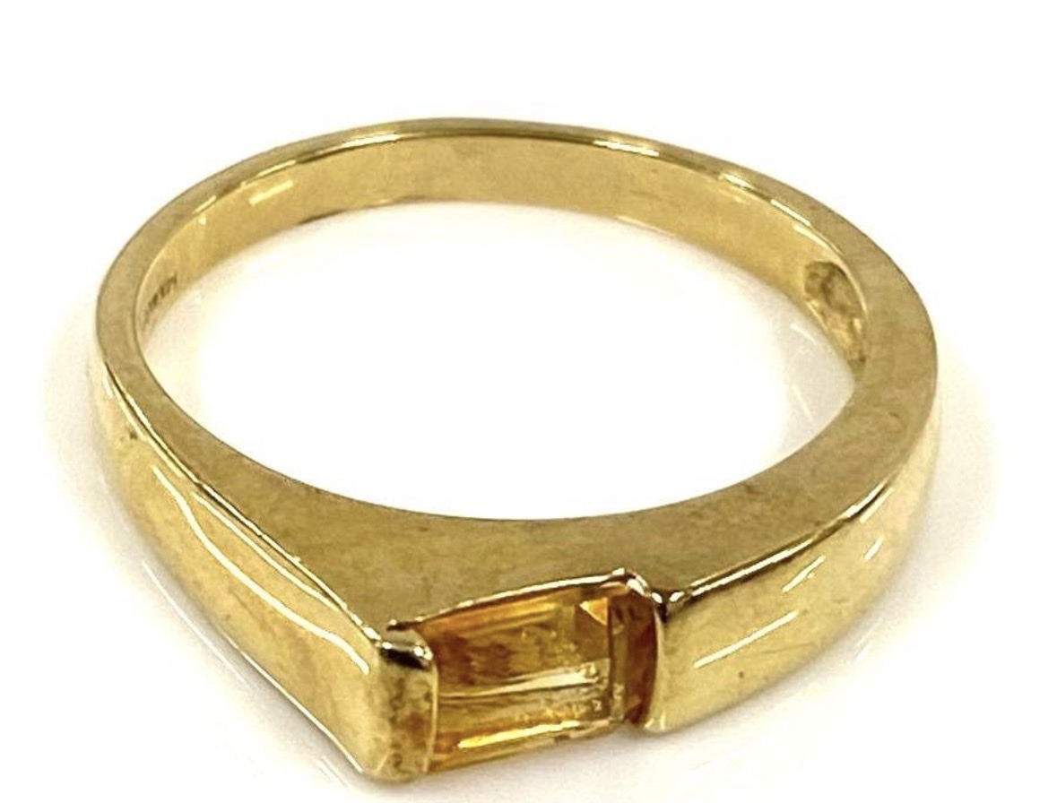 This is a contemporary-style signet-inspired band ring crafted in 14K yellow gold, weighing approximately 2.94 grams. The central design features a single emerald-cut citrine gemstone, displaying a vibrant golden-yellow hue. The gemstone is set in a low-profile, semi-tension style, where the metal of the band wraps partially around the short ends of the stone, providing a sleek and flush appearance. The band itself is a size 7 and exhibits a polished finish. In terms of construction, the ring tapers slightly toward the back of the shank, while the shoulders broaden to meet the edges of the rectangular gemstone. Based on the provided context, the interior of the shank is stamped with a '14k' purity mark and a maker's mark that appears to be either 'MGJ' or 'MOS'. The condition appears to be pre-owned but well-maintained, with minor surface micro-scratches and light wear consistent with regular use. There are no immediate signs of structural damage or significant thinning of the shank. The craftsmanship reflects a clean, minimalist aesthetic likely from the late 20th to early 21st century. The use of a smooth, 'snag-free' setting makes this piece highly functional for daily wear while maintaining a sophisticated, geometric jewelry style.