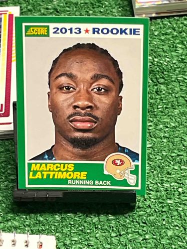 This is a 2013 Score football trading card featuring Marcus Lattimore during his rookie season with the San Francisco 49ers. The card is standard size, constructed from glossy cardstock, and features a prominent green border characteristic of the 2013 Score base set design. The front displays a close-up portrait of Lattimore. Notable design elements include the 'SCORE' logo in the top left corner, the text '2013 ROOKIE' at the top, and the player's name and position at the bottom. A small illustration of a San Francisco 49ers helmet is positioned in the lower right corner. The centering of the card appears slightly off, shifted towards the left. The corners show very minor signs of wear but remain relatively sharp. There are no obvious surface scratches or creases visible in the provided image. This card was manufactured by Panini America under the Score brand. It represents a piece of football history for a highly touted college prospect whose career was unfortunately cut short by injuries, making it a sentimental item for South Carolina Gamecocks and 49ers collectors alike.