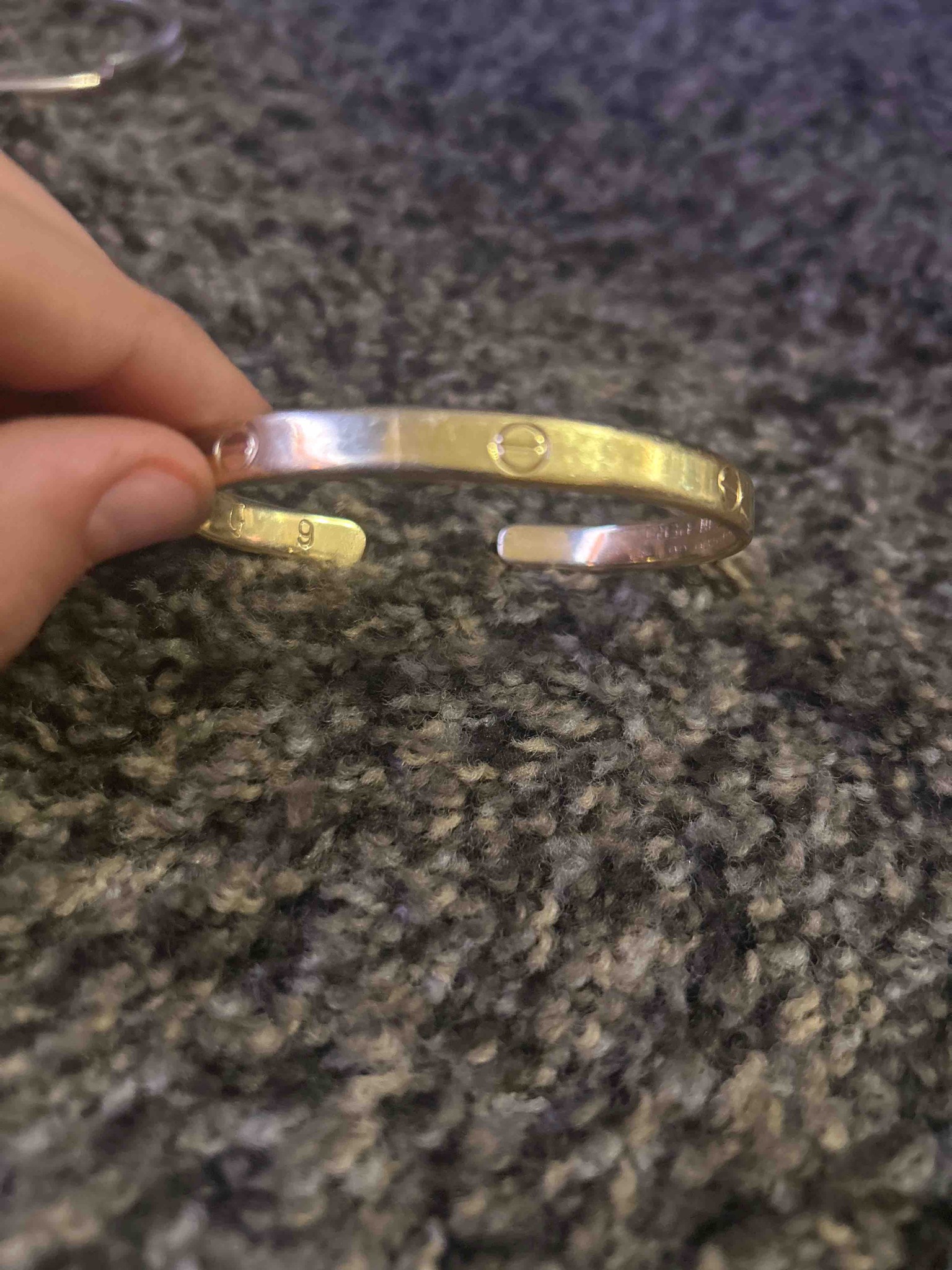 This is a rigid cuff-style bracelet modeled after the iconic 'Love' collection by Cartier. The piece features a flat, polished band approximately 6mm in width, characteristic of the standard size for this style. It is rendered in a yellow gold-toned metal, though visible silver-colored highlights and uneven reflections suggest it may be gold-plated over a base metal or sterling silver rather than solid yellow gold. The exterior is punctuated by several engraved 'screw head' motifs, which are the hallmark of this design. Notably, the interior shows a size engraving of '19', which is the standard millimeter circumference measurement used by Cartier. The condition of the piece shows signs of moderate wear, including fine surface scratching, some dulling of the luster, and potential thinning of the plating on the edges. There are visible interior hallmarks that appear to include brand-style lettering, though their sharpness and depth are difficult to verify from this angle. The cuff is open-ended, allowing it to be slipped on the wrist without the traditional screwdriver mechanism found on the full bangle version of the design.