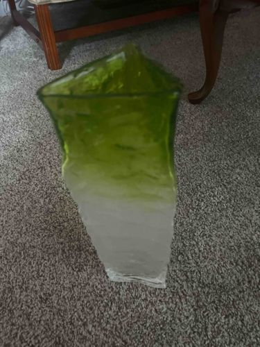 This item is a decorative glass vase featuring a distinctive triangular form with a heavily textured 'bark' or ice-glass finish. The piece displays a sophisticated vertical ombre color transition, starting with a clear, crystalline base that gradually blends into a vibrant lime green or peridot hue toward the rim. The texture is organic and irregular, evocative of mid-century Scandinavian or Italian art glass traditions, such as the works of Whitefriars or various Murano glassmakers. Physically, the vase appears to be of substantial weight with thick walls and a ground, flat base. The rim follows the sharp triangular geometry of the body, creating an architectural silhouette. In terms of condition, the glass retains its clarity without visible significant clouding or 'sick glass' syndrome, though there may be minor shelf wear on the bottom surface. No major chips or cracks are immediately apparent from the visual inspection. The craftsmanship suggests a mold-blown or pressed technique designed to mimic hand-chiseled stone or frozen water. While no specific maker’s mark is visible in the image, the style and color palette are consistent with mid-to-late 20th-century decorative arts, likely dating from the 1960s to 1970s.