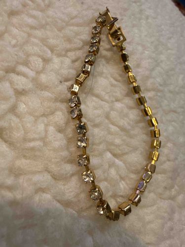 This item is a single-row tennis bracelet featured in a yellow gold-toned metal setting, likely gold-plated or gold-filled base metal. The construction consists of a series of rectangular box links, each individually set with a round-cut clear stone, which appear to be cubic zirconia or glass paste. The stones are held in place by a four-prong setting integral to each link. The bracelet features a fold-over clasp mechanism, which is typical of costume jewelry from the late 20th century, approximately the 1980s to 1990s. In terms of condition, there is visible wear to the gold plating on the clasp and the edges of the links, revealing a darker base metal underneath. This indicates significant use and age. The stones appear to have a slight yellowish tint, which may be due to the accumulation of dirt or the natural aging of the adhesive or foil backing if they are rhinestones. No specific maker's marks or hallmarks are visible in the provided image. The overall craftsmanship is consistent with mass-produced fashion jewelry, characterized by the simple mechanical hinge connections between the links and the utilitarian design of the clasp.