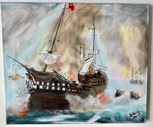 This 20 x 24-inch piece is an original oil painting on canvas depicting a dramatic maritime naval battle, likely inspired by the age of sail. The composition features two large multi-masted galleons or men-of-war in close-quarters combat, centered against a turbulent backdrop of fire and thick smoke. The color palette is dominated by dark browns and blacks for the ship hulls, contrasted against a hazy sky filled with ochre, yellow, and grey tones suggesting cannon fire and environmental fog. The water is rendered with broad, energetic strokes of teal, white, and deep blue. A notable feature is the red flag atop the primary ship, which bears a crescent and star, suggesting the vessel represents the Ottoman Empire. The painting style is impressionistic and expressive, characterized by thick impasto and visible, textured brushwork that prioritizes movement and atmospheric tension over fine technical detail. The artwork is signed in the lower right corner, although the signature is stylized and requires further research for definitive attribution; a date of '08' is visible, suggesting it was produced in 2008. The canvas appears to be in good contemporary condition with no visible cracks, foxing, or significant pigment loss. It is currently unframed, with the image wrapping slightly around the edges of the stretcher bar.