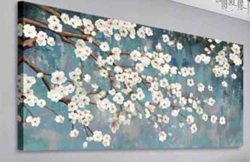 This is a large-format horizontal canvas wall art piece featuring a decorative depiction of white cherry or plum blossom branches. The artwork is rendered on a gallery-wrapped canvas, meaning the image continues around the edges of the wooden stretcher frame, eliminating the need for an external frame. The background is a textured, painterly wash of teal, blue, and grey tones, creating a contemporary and tranquil atmosphere. The floral elements are painted in shades of crisp white and cream with subtle pink or dark centers, appearing to cascade from the top left corner across the composition. The branches are painted in a contrasting dark brown with visible brushwork that suggests texture. This piece appears to be a modern commercial production, likely an inkjet print on canvas with potential hand-painted accents (impasto) to add depth to the petals. The condition appears new or excellent with no visible fading, tears, or warping. Its style is a mix of modern impressionism and traditional Asian floral motifs, suitable for contemporary interior design. The craftsmanship shows clean lines and a vibrant color palette, designed for high visual impact in residential or office spaces.