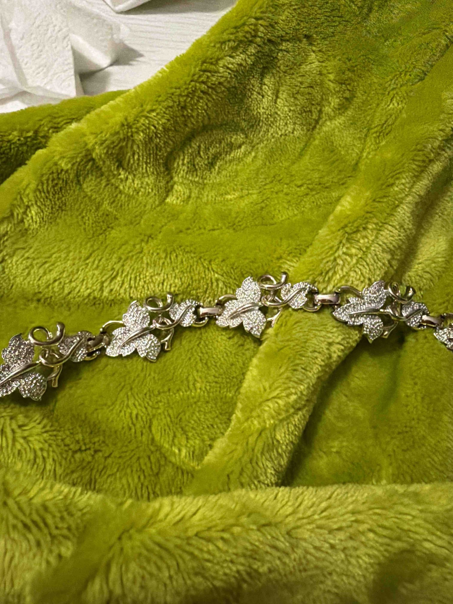 This is a vintage articulated links bracelet, characteristic of American costume jewelry from the mid-20th century, specifically the 1950s to 1960s. The piece features a botanical motif consisting of stylized, textured leaves—specifically reminiscent of grapevine or maple leaves—alternating with polished vine-like 'S' scrolls. The bracelet is constructed from a silver-toned base metal, likely rhodium-plated to prevent tarnishing and maintain its bright, white-metal luster. Each link is intricately textured with a 'brushed' or ' Florentine' finish on the leaf surfaces, which contrasts with the smooth, high-polish finish of the connecting vine segments. The articulation is achieved through hidden pin hinges that allow the bracelet to wrap fluidly around the wrist, a hallmark of higher-quality costume jewelry manufacturers such as Trifari, Coro, or Monet. While no makers' mark is clearly visible in the provided image, the design aesthetic and casting quality strongly suggest a designer like Trifari, particularly their 'L'Orient' or similar floral collections. The condition appears very good, showing minimal signs of metal wear or finish loss. There is no visible verdigris (green oxidation), and the silver plating remains vibrant. The absence of missing stones is notable, as this is a complete metal-work piece without rhinestones, focusing instead on textural contrast and sculptural form.