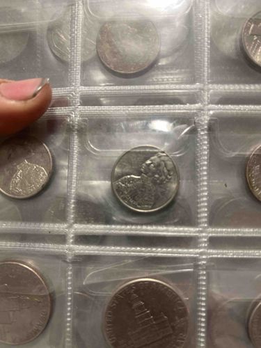 This collection consists of several United States Jefferson Nickels housed within a clear plastic numismatic storage page. The primary coin in focus appears to be a 2005 Jefferson Nickel featuring the 'Westward Journey' profile of Thomas Jefferson on the obverse. This specific design was a one-year-only release where Jefferson's portrait is oriented to face forward/right, differing from the traditional left-facing profile used since 1938. The coins are struck in a cupro-nickel alloy (75% copper, 25% nickel) with a diameter of 21.21 mm and a smooth edge. The coins exhibit varying degrees of circulation wear and surface oxidation; the central coin shows significant dark gray toning and environmental tarnish, while others in the folder show more typical metallic luster. Below the central coin, the reverse of another nickel is visible, showing the iconic Monticello estate with the inscriptions 'UNITED STATES OF AMERICA' and 'E PLURIBUS UNUM' clearly struck along the rim. The clear pockets show some scuffing and dust, but provide a protective barrier for the specimens. These pieces represent a transitional period in American coinage design from the early 21st century.