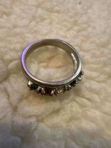 This is a contemporary-style band ring crafted in 10-karat white gold, evidenced by the light silvery-yellow hue common in lower-karat white gold alloys after rhodium plating has worn thin. The ring features a multi-stone channel or heavy prong-set arrangement across the top half of the shank. The stones appear to be a variety of round or square-cut gemstones in different colors, including emerald green, ruby red, and a clear or white stone, which is a design characteristic of a 'Mother's Ring' representing various birthstones. The inner band shows a partially legible hallmark that includes a '10k' stamp and what appears to be a manufacturer's mark. The band is approximately 3mm to 4mm in width with a high-polished finish on the inner and outer surfaces. Regarding condition, there is visible surface wear including fine scratches (scuffing) and a dulling of the original finish, particularly along the edges of the shank and the underside. Some accumulations of dirt or biological material are present around the stone settings, suggesting regular wear. The prongs appear thick and secure, though the overall craftsmanship suggests a mass-produced fine jewelry piece rather than a custom artisan work. Estimated age is from the late 20th century to early 21st century.
