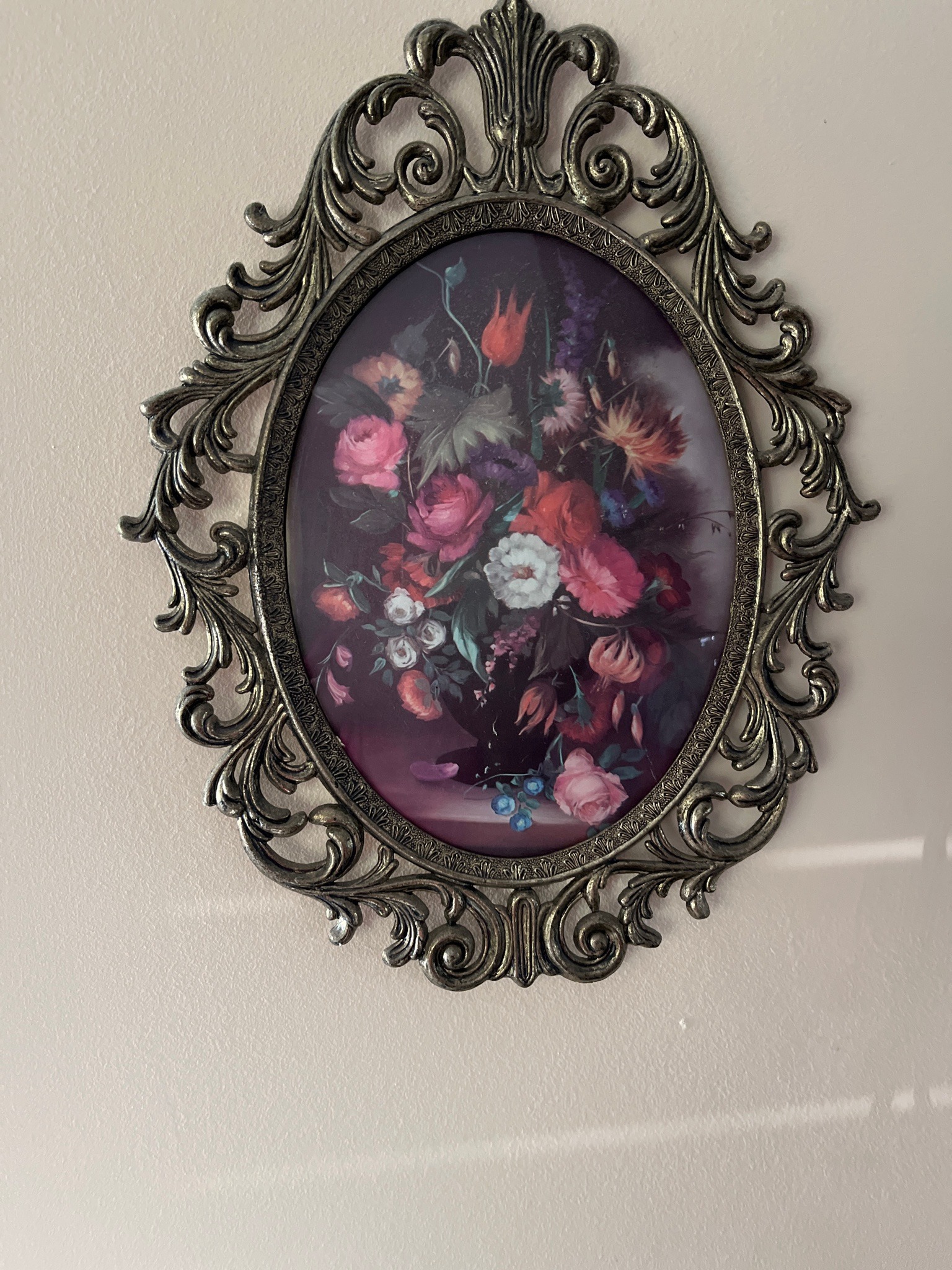 This item is an oval-formatted floral still life print housed within a highly ornate, openwork filigree metal frame. The artwork depicts a lush bouquet in the Dutch Golden Age style, featuring a variety of blooms including pink roses, white carnations, and tulips set against a deep moody purple or black background. The oval frame is composed of cast metal, likely brass or a lead-based alloy with an antiqued bronzed finish. It exhibits classic Rococo-revival motifs, including symmetrical C-scrolls, acanthus leaf flourishes, and a prominent fanned crest at both the top and bottom. The metalwork shows signs of age-appropriate patina and slight oxidation in the deeper recessed areas, which adds to its vintage character. The inner bezel of the frame features a fine repeating bead or rope pattern, providing a clean transition to the convex or flat glass covering the print. The overall construction suggests a mid-20th-century decorative piece, possibly manufactured in Italy or by a specialty American decorator firm like Syroco or Homco (though this appears to be a heavier metal casting rather than plastic). The condition is generally good, with no visible cracks in the glass or significant breaks in the delicate scrollwork, though light surface dust is present.