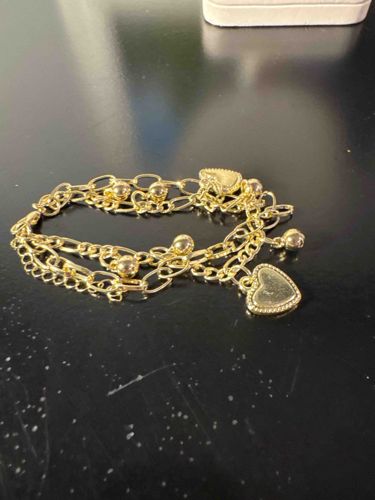 This jewelry piece consists of a multi-strand gold-colored bracelet, featuring three distinct chain tiers of varying styles, including oval link and cable link designs. The construction is characterized by its layered aesthetic, integrating several dangling charms that include two polished flat heart pendants with decorative beaded borders and multiple spherical bead charms. These components are joined to the main chain by jump rings. The material appears to be a gold-toned base metal, likely brass or zinc alloy with a high-polish plating, as it exhibits a very bright yellow sheen typical of contemporary costume jewelry rather than solid gold. The workmanship reflects mass-market production, evidenced by the basic assembly of the dangling elements and the standard lobster claw clasp closure with an adjustable extender chain. Condition-wise, the item shows some surface scratching on the main heart charm and minor tarnishing in the crevices of the links, suggesting moderate previous wear or exposure. There are no visible maker's marks, signatures, or metal purity stamps (such as '14K' or '925'), confirming its status as a fashion accessory. Its style is modern and feminine, likely produced within the early 21st century.
