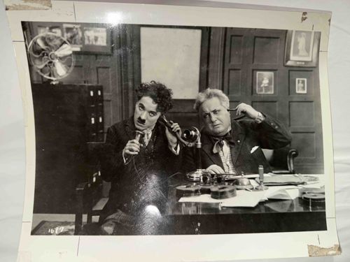 This is a vintage black and white gelatin silver print production still featuring Charlie Chaplin and Mack Swain. The image depicts Chaplin in his iconic Little Tramp persona alongside Swain, both engaged with a candlestick telephone at a desk. The photograph measures approximately 8x10 inches. The composition shows high contrast typical of early 20th-century cinematography, with visible film grain. Notable features include a production code '1682' in the bottom left corner and crop marks along the white borders, suggesting it was used for editorial or promotional publication. The condition shows significant wear consistent with age, including curling of the photographic paper, edge tears (most notably in the upper and lower right corners), and surface abrasions with light reflecting off a glossy finish. The background detail includes a period-appropriate electric fan, wood-paneled walls, and office desk accessories. This piece represents a significant era of silent film history, specifically relating to Chaplin's work with First National Pictures in the early 1920s.