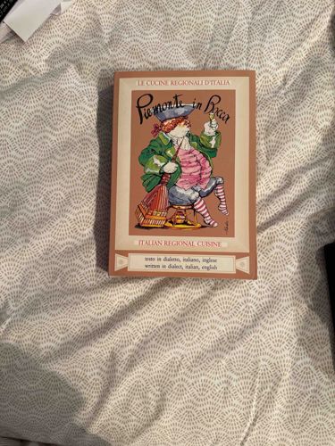This is a hardcover edition of the cookbook 'Piemonte in Bocca' from the renowned 'In Bocca' series published by Editrice II Vespro. The cover features a distinctive whimsical illustration of a character in 18th-century attire holding a glass and a broom, set against a peach or terracotta-colored background. The physical book appears to be a standard octavo size, bound with a matte-finish paper over boards. A key feature of this specific series is its trilingual nature; the text is provided in local Piedmontese dialect, standard Italian, and English, making it a valuable cultural artifact for both culinary experts and linguists. The typography on the cover uses a stylized script for the title and a classic serif for the secondary information. This series was largely produced in the late 1970s and 1980s, reflecting a specific period of Italian regional pride. The condition shown in the image is good, with some light shelf wear along the edges and corners, particularly at the bottom spine, but no major structural damage or moisture staining is visible. The printing quality suggests a high-end specialty press production common for this series, which is known for its collectible nature and its celebration of hyper-local culinary traditions.