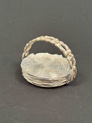 This exquisite set consists of a small, decorative basket-style caddy holding six matching miniature plates or salt cellars. The entire set is crafted from a bright metallic material, likely sterling silver or high-grade silver plate, exhibiting a cool, lustrous sheen. The caddy features a highly ornate fixed arch handle decorated with a series of relief-molded dogwood flowers and foliage, connected by delicate openwork links. The circular plates nestled within the basket feature a deeply textured, radiating repoussé or chased pattern resembling stylized organic petals or a leaf-like vein structure. Each plate has a subtly irregular edge to enhance the floral aesthetic. In terms of condition, the items show a light, even patina with minor tarnishing in the deeper recesses of the floral handle and the plate textures, which is typical for vintage silver. There is no evidence of significant structural damage, bending, or deep scratches, indicating the set has been well-maintained. While maker's marks are not clearly visible in the photograph, the level of craftsmanship, particularly the crispness of the floral casting on the handle, suggests a mid-20th-century origins, possibly American or European. The set showcases high decorative value and quality metalwork, often seen in luxury tabletop accessories from the late Art Nouveau or Mid-Century traditional periods. Points of quality include the seamless integration of individual flower heads on the handle and the uniformity of the six interior plates.