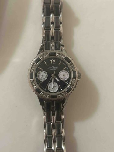 This is a contemporary ladies' timepiece from the Anne Klein collection, featuring a multi-functional black sunray dial with silver-tone accents. The watch exhibits a round stainless steel case with a unique bezel that alternates between black ceramic-style inserts and clusters of crystal embellishments. Each cluster appears to contain four small crystals, designed to simulate diamonds as indicated by the 'DIAMOND' text on the dial. The dial features three white sub-dials providing day, date, and 24-hour timekeeping functionality. A prominent Arabic numeral '12' is positioned at the top, while the other hour markers are sleek silver-tone indices. The 'AK ANNE KLEIN' brand logo is clearly visible below the 12 o'clock position. The integrated bracelet is constructed with silver-tone metal links surrounding rectangular black ceramic center links, creating a cohesive two-tone aesthetic. Condition-wise, the watch shows signs of moderate wear, with visible light surface scratches on the metal links and bezel surface. The mineral crystal appears relatively clear but would need a closer inspection for micro-scratches. The craftsmanship is typical of high-street fashion brands, focusing on aesthetic appeal and functional quartz-movement reliability from the early to mid-2010s.