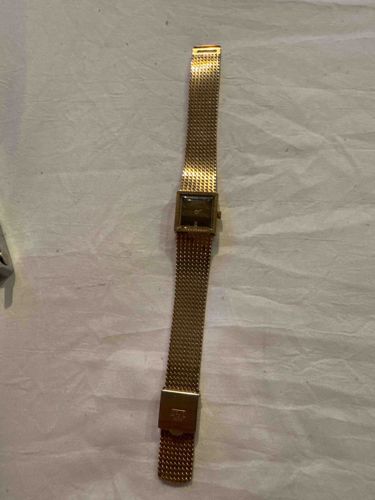 This is a vintage ladies' dress watch featuring a minimalist square-shaped case with a gold-tone finish. The timepiece is characterized by its integrated yellow gold-tone Milanese mesh (shark mesh) bracelet, which is designed to taper slightly toward the clasp. The watch face is small and dark, likely black or dark brown, with minimal visible indices, suggesting a mid-to-late 20th-century aesthetic (circa 1970s-1990s). The construction utilizes a fold-over jewelry-style clasp, which appears to have a manufacturer's logo or crest etched onto the metal surface, though the specific brand is difficult to verify without high-resolution magnification. The crystal appears slightly raised and square, matching the geometry of the case. In terms of condition, there is visible surface wear including minor scratches and slight discoloration (patina) on the gold plating, particularly around the edges of the clasp and watch case, which is common for gold-filled or plated items of this age. The mesh links appear intact without significant fraying or crimps. Metalwork shows a high level of detail in the weaving of the band, indicating a quality decorative fashion manufacture rather than a purely utilitarian piece.