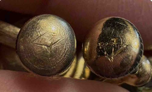 This pair of vintage jewelry components, likely formal shirt studs or small cufflinks, showcases a mixed-metal construction typical of high-end early 20th-century craftsmanship. Each piece features a domed, circular head finished with a distinctive brushed or frosted texture. One appears to be crafted from yellow gold while the other shows a darker, possibly tarnished silver-tone metal such as platinum or white gold. The yellow gold stud features a prominent engraved square/rhomboid maker's mark or decorative symbol at its center. The darker stud displays a more complex engraving that appears to be a stylized crown or heraldic crest above a chevron-like base. The edges of the darker stud feature a delicate milgrain or coin-edged border, a hallmark of Art Deco or Edwardian period detailing. In terms of condition, the items show significant superficial wear, including fine scratching, surface oxidation, and debris accumulation in the recessed engraving areas. The darker piece displays some loss of original luster or potentially the remnants of a specialty finish. These artifacts appear to be hand-finished, indicating a high level of artisanal quality from the mid-Victorian to early Art Deco period (circa 1890-1930).