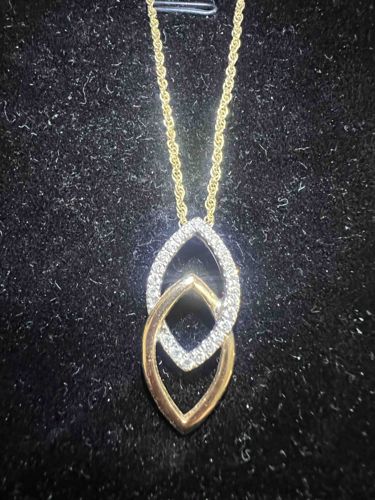 This contemporary pendant necklace features a sophisticated two-tone interlocking design, suspended from a slender gold-toned rope chain. The central pendant consists of two pointed, marquise-shaped (or 'eye-shaped') loops that are permanently intertwined. The upper loop is crafted in a white-toned metal—likely white gold or platinum—and is densely pavé-set with numerous small, round-cut clear gemstones, probably diamonds or high-quality cubic zirconia, which provide significant brilliance and light return. These stones are held in place by tiny prongs, creating a shimmering, textured surface. Interlocking through the center is a second marquise form crafted in a smooth, polished yellow metal, consistent with yellow gold. This lower loop features a sleek, high-shine finish with clean edges and a slight taper towards the points, creating a graphic contrast with the sparkling upper element. The pendant is attached to the chain via a hidden bail or by the chain passing directly through the upper loop, allowing for fluid movement. The chain itself is a finely woven rope style, which adds a classic touch to the modern pendant design. In terms of condition, the piece appears well-maintained with no visible missing stones or significant scratches on the polished surfaces. The style is indicative of modern fine jewelry from the late 20th to early 21st century. The craftsmanship appears to be of high quality, evidenced by the precision of the stone setting and the seamless integration of the two metal components.