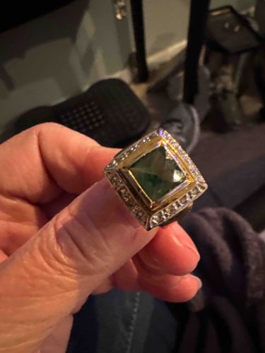 This is a substanial cocktail or statement ring featuring a large, square sugarloaf-cut or steep cabochon gemstone in a deep forest green hue, possibly an emerald, jadeite, or green tourmaline. The central stone is securely housed in a thick, polished yellow gold bezel setting. Encircling this primary setting is a tiered square halo crafted from a white metal, likely platinum or white gold, which is pav-set with numerous small, round brilliant-cut diamonds. The tiered architecture of the ring head suggests a Mid-Century Modern or late 20th-century influence, focusing on geometric symmetry and mixed metal aesthetics. The visible portion of the band appears thick and commensurate with the heavy weight of the head. Regarding condition, there is visible surface wear to the metal, particularly on the gold bezel which shows fine scratches and a slight dulling of the polish. The green gemstone shows some internal inclusions and potential surface abrasions consistent with regular use. No maker's marks or hallmarks are visible in the photograph, but the craftsmanship level indicates professional jewelry production. The overall design displays a high-quality approach to modern formal jewelry.
