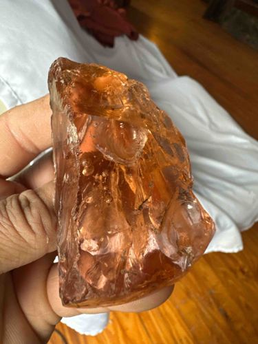 This item is a large chunk of cullet or 'slag glass,' likely a byproduct of industrial glass manufacturing. It exhibits a vibrant apricot or honey-amber hue and is translucent to transparent in quality. Physically, the piece measures approximately three to four inches in length, featuring a rugged, irregular shape with prominent conchoidal fracturing. This shell-like breakage pattern is characteristic of amorphous silica materials. The internal structure contains various spherical gas bubbles (seeds) of varying sizes, which indicate it was cooled from a molten state rather than formed through natural geological processes like quartz or amber. The exterior surfaces show a mix of sharp, fresh glassy edges and matte, slightly weathered areas. There are no maker's marks or signatures visible, as this is raw material rather than a finished piece of decorative art or glassware. It appears to be an mid-20th-century specimen, often salvaged from glass factory dump sites. The lack of a crystal structure and the presence of uniform coloring throughout suggest This is man-made glass, valued primarily by collectors of industrial artifacts or as raw material for landscape decoration and lapidary work.