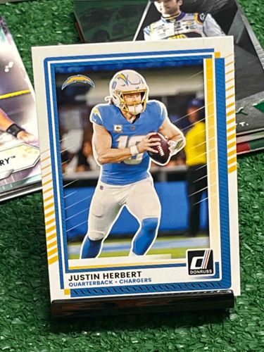 This is a standard 2.5 by 3.5-inch modern sports trading card featuring Justin Herbert, the quarterback for the Los Angeles Chargers. The card is from the 2021 Donruss Football set, produced by Panini America. It features a high-gloss color action photograph of Herbert in his powder blue Chargers home uniform, white pants, and a white helmet with the distinctive yellow 'bolt' logo. The card design incorporates a thick blue border with white pinstripe accents and yellow diagonal hashed lines in the corners, mimicking the Chargers' team colors. The 'Donruss' brand logo is visible in the lower right corner, while the player's name and position are clearly printed in the lower white margin. The construction consists of a multi-layered cardstock with a glossy coating on the front surface. Regarding condition, the card appears to have sharp corners and straight edges based on the visual perspective, though there is a slight vertical tilt in the provided image. There are no obvious surface scratches, creases, or major printing defects visible from this distance. The centering appears slightly heavy toward the bottom margin, a common variance in modern mass-produced trading cards. The card is currently displayed on a black stand over a green textured 'turf' background, indicating it is likely part of a contemporary collector's inventory.