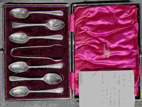 This is a vintage seven-piece cutlery set consisting of six matching teaspoons and a single pair of sugar tongs, presented in a fitted presentation case. The spoons feature an elegant, classic fiddle-pattern or similar rounded terminal design, typical of English silver traditions. The items are silver-plated, showing a reflective finish with noticeable surface oxidation and darkening (tarnish), particularly visible in the bowls of the spoons and along the handles. The rectangular presentation case is lined with deep burgundy or maroon velvet on the recessed base to secure each piece, while the interior lid is lined with a ruched magenta or fuchsia satin fabric. The lid liner bears a clear gold-stamped maker's mark identifying the origin as Sheffield, a world-renowned center for cutlery production. The style and packaging suggest a late 19th-century to early 20th-century manufacture date (Victorian or Edwardian era). The set shows signs of moderate age-related wear, including minor scuffing to the exterior case and consistent patina on the metal surfaces, but remains complete. The craftsmanship is evident in the uniform shaping of the spoon bowls and the tension of the sugar tongs. A handwritten note is included within the box, likely providing provenance or specific historical details relevant to a private collection.