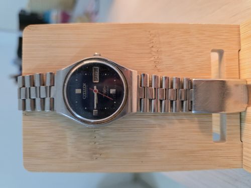 Vintage Citizen Automatic watch, made in Japan, 21-jewel mechanical movement, blue dial, Arabic day/date display, stainless steel case and bracelet.