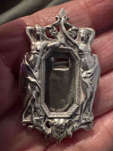 This is an intricate Art Nouveau style decorative piece, likely a watch fob, belt slide, or chatelaine hook component. The item is constructed from a silver-toned metal, possibly sterling silver or silver-plated brass, displaying a high-relief repoussé or cast design characteristic of the late 19th to early 20th century (circa 1890-1910). The central motif features two graceful semi-nude female figures flanking an elongated octagonal frame. These 'maidens' are rendered with flowing drapery and stylized hair, quintessential of the Belle Époque era. The central frame is empty, originally intended to hold a small photo, clock face, or gemstone. It features a fine milgrain or beaded border. A small, circular hallmark is visible near the top center scrollwork, though it is too blurred to identify specifically. The reverse shows a rectangular slot or bridge, suggesting it was designed to be slid onto a ribbon or leather strap. The condition shows moderate surface wear and significant dark oxidation (tarnish) in the recessed areas, which serves to highlight the fine detail of the metalwork. There are no obvious structural repairs, though the lack of an inset suggests a missing original component.