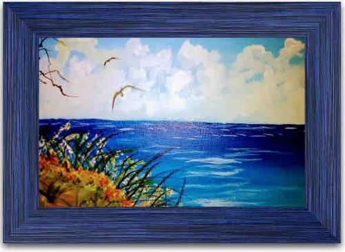 This item is a landscape-oriented coastal seascape painting housed in a wide, decorative blue molded frame. The artwork depicts a bright ocean scene under a sky filled with volumetric white cumulus clouds. In the foreground, a sandy or earthy bank is visible on the left, populated with orange and yellow flora and dark green sea grass blades. Two birds, likely gulls, are captured in flight against the sky. The palette is dominated by various shades of blue, from the deep ocean horizon to the lighter turquoise of the shallows and the cobalt of the frame. The medium appears to be oil or acrylic on canvas or board, characterized by visible brushwork particularly in the sky and water. The frame features a textured, reeded linear pattern with a blue-wash finish that complements the aquatic theme. The condition appears to be good with no obvious tears or significant paint loss visible, though the frame shows slight variations in the blue stain which appear intentional. Based on the style and framing, this appears to be a contemporary decorative piece, likely from the late 20th or early 21st century. No artist signature is clearly visible in the provided image.