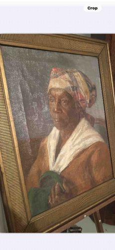 This item is an oil-on-canvas portrait depicting an elderly African American woman, presented in a three-quarter view. The subject is dressed in a warm, ochre-colored garment with a prominent white shawl or collar, and her head is wrapped in a multi-colored patterned scarf featuring red and blue tones. The brushwork exhibits an impressionistic quality, with visible, layered strokes that build texture, particularly in the highlights of the skin and the folds of the clothing. The color palette is earthy and subdued, using siennas, umbers, and muted grays in the background to emphasize the sitter. The subject’s expression is somber and dignified, suggesting a realistic portrayal common in early 20th-century American portraiture. The painting is housed in a period-appropriate gilded frame with decorative reeding and a textured inner border. In terms of condition, there is visible surface grime and a slight dulling of the varnish, which is consistent with age. Subtle craquelure is visible in the heavier application of paint, though no significant flaking or loss is immediately apparent from the image. While a signature is not clearly legible in the lower right corner, the style suggests a professional hand from the late 19th to early 20th century. This piece is significant for its sensitive and evocative representation of its subject, reflecting the social history and artistic realism of its era.
