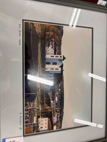 This item is a professionally framed landscape photograph oriented horizontally, capturing a scenic view of Bay Bulls, Newfoundland. The image features a prominent white coastal church with two distinct towers as the central architectural focal point, surrounded by a rolling landscape of hills and scattered houses. The photograph is matted with a light grey or off-white matting that includes a black accent inner border, which provides a professional and clean presentation. Handwritten in black ink on the lower portion of the mat are the identifying details: 'Bay Bulls, NFLD' on the left side and the artist's signature 'R. Pitcher' followed by a copyright symbol on the right. The frame appears to be a modern, dark metal or wood construction with a thin profile and a brushed finish. The glass reflects overhead fluorescent lighting, suggesting it is a standard clear glass rather than non-reflective museum glass. Based on the style of the photography, the handwriting, and the framing materials, the piece likely dates from the late 20th century to early 21st century. The condition appears excellent with no visible foxing, water damage, or fading to the print, and the frame shows minimal wear. The composition highlights local geography and architecture, common in regional Canadian landscape photography.