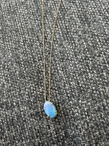 This necklace features a single cabochon-cut opal, likely an Australian crystal opal or boulder opal, characterized by its vibrant play-of-color displaying dominant hues of electric blue and cyan with subtle green undertones. The stone is oval-shaped and is securely held by a four-prong setting made of yellow metal, possibly 14k or 18k yellow gold, though no hallmarks are visible in the photograph. The pendant is suspended from a delicate cable link chain, often referred to as a trace chain, which appears to be of the same metallic composition. The opal exhibits a smooth, high-polish finish with no immediate signs of surface crazing or deep fractures, which are critical for value assessment in silica-based gemstones. The craftsmanship shows minimalist modern styling, suggesting a contemporary manufacturing date within the last 20 years. The setting is designed to allow maximum light penetration through the stone's surface, enhancing its natural iridescent properties. The chain appears integrated through small loops on the top of the setting, a common design element in modern fine jewelry to ensure the pendant remains centered. Overall, the piece displays high-quality finishing with no evident wear or metal fatigue.