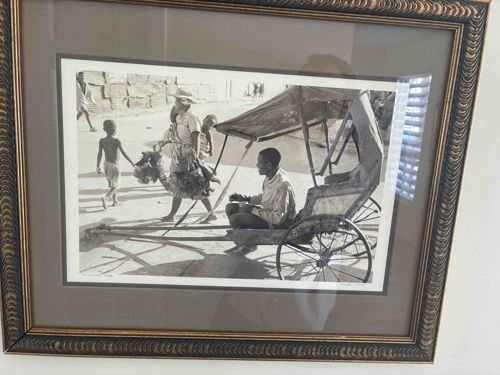 This item is a professionally framed black and white silver gelatin or high-quality monochrome print, capturing a candid street scene likely in Madagascar. The central subject is a man seated in a 'pousse-pousse' (rickshaw), interacting with people on the street, including a woman carrying items and children. The photograph displays a sharp range of tonal values from deep blacks to bright highlights. It is matted with a dual-toned brown and cream matboard, housed within a substantial wooden frame featuring an ornate, scalloped or gadrooned gold-gilt and dark-wood finish. Visible in the lower margins are penciled inscriptions: the left appears to be a limited edition numbering (e.g., '1/25'), and the right is a signature, suggesting it is a fine art piece rather than a mass-production. The framing appears contemporary and in good condition, though the glass shows reflections. The print itself shows no immediate signs of foxing or warping, indicating proper mounting. This piece exemplifies mid-to-late 20th-century social documentary photography style.